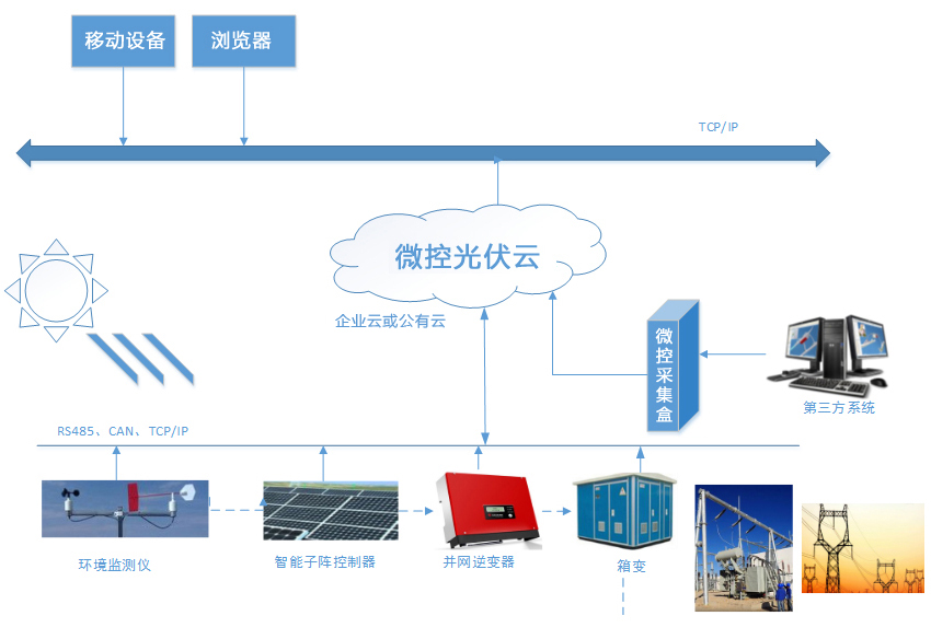 光伏行业信息化解决方案依据物联网网关技术,根据光伏发电各环节对发电设备运行数据的采集与控 制,依托互联网线上线下互动实现对光伏发电系统进行实时监控,为变电站运行及维护提供有效指导 ,辅助高层领导进行电站投资决策。