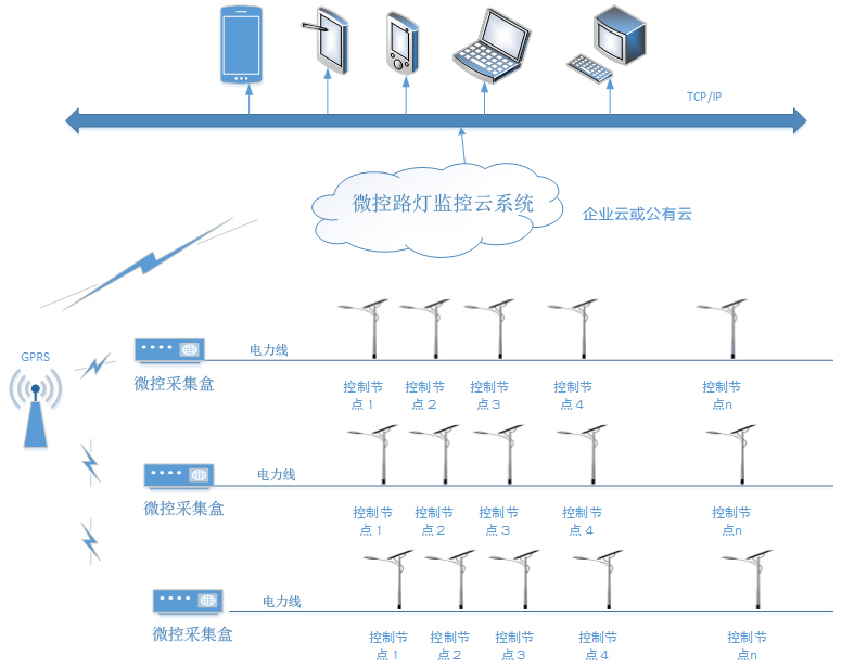 本方案利用我司自身技术研发优势,成功地研制出应用于路灯远程监控系统的智能工业网关系统,通 过通信网络和计算机模块,为路灯管理处实现了辖区内路灯遥控、遥信、遥测等统一管理功能。