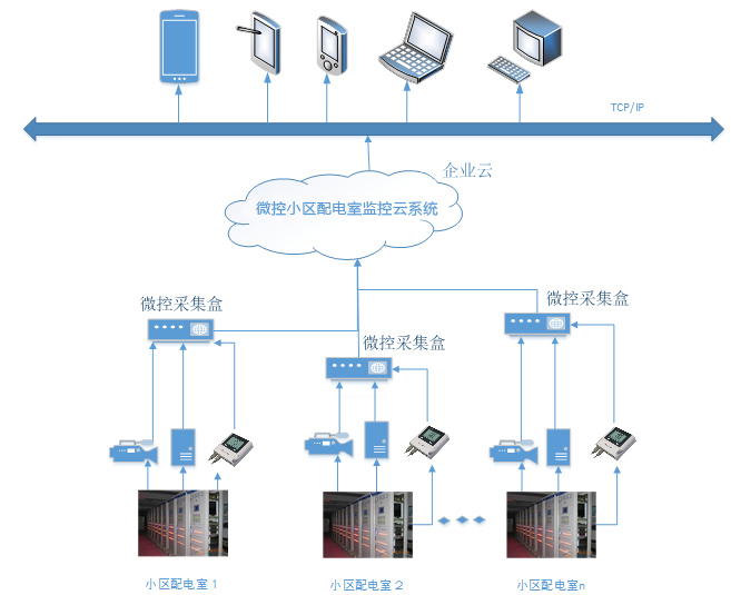在各小区配电房里设置温湿度传感器与摄像机,使得电网公司管理人员能直接通过网络 传回来的视频图像,掌握各小区配电房的温度、湿度及环境情况,及时发现不良事件,加强配电房管 理。