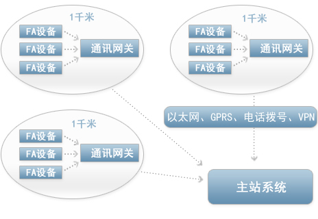 工业现场有时要跨越几千米到几十千米的距离,而现场的FA有效通讯范围只有一千米多 如城市电网配网、调度系统,城市轨道交通系统,石油、天然气的开采 传输系统 通讯网关 可以完成一千米范围内的FA数据采集,然后通过公网传输给主系统.
