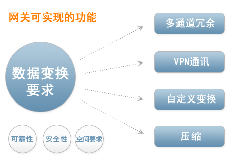 有些应用领域对通讯有特殊要求,如可靠性,安全性,空间要求,等,网关可以实现多通道冗余,VPN通讯,自定义变换、压缩等功能。